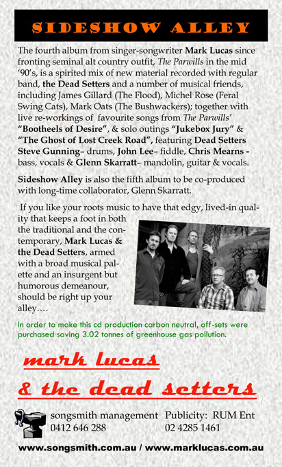 You can expect a swag of new material featuring various Dead Setters & some very talented friends (including James Gillard, Michel Rose, Robbie Souter & Gary Brown) along with a bunch of new songs and favourites from The Parwills & Mark’s first two solo albums, recorded live in the studio with the Dead Setters. Once again Glenn Skarratt co-produces with Mark- a fitting end to a very productive decade or so.